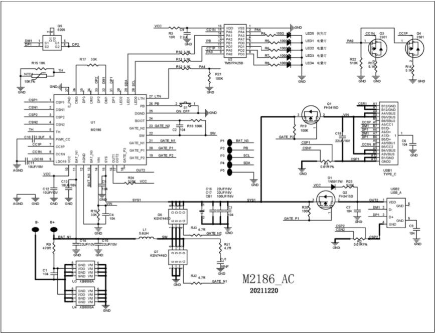 2-4節電池快充充電管理SOC ,內置PD3.0、PD2.0、QC3.0、QC2.0、BC1.2 DCP、UFCS等協議 |