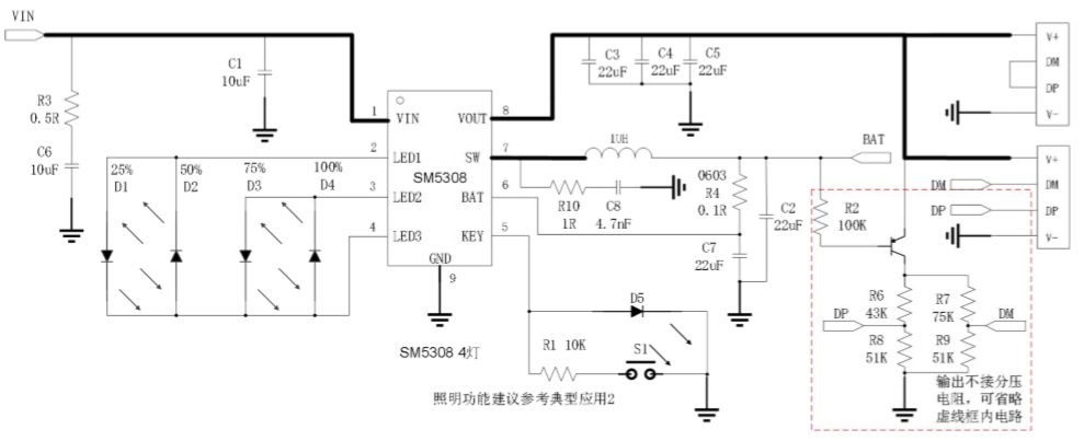 SM5308是一款集成升壓轉換器、 鋰電池充電管理、電池電量指示的多功能電源管理 SOC,為移動電源提供完整的電源解決方案。