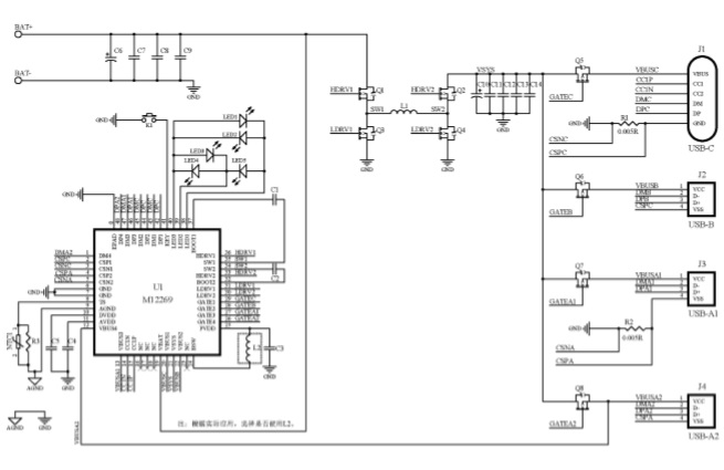 M12266H是一款面向多串電芯大功率移動電源應用的專用 SOC,集成了同步升降壓電壓變換器、電池充 放電管理模塊、顯示模塊、電量計算模塊,提供最大 100W 輸入/輸出功率,支持 PD3.0、QC3.0、AFC、FCP、SCP、BC1.2 DCP、UFCS 等主流快充協議,并提供輸入/輸出的過壓/欠壓、電池過壓、過充/過放、NTC 過溫、放電過流、輸出短路保護等完備的保護功能。配合極簡的外圍電路,即可組成100W 多口移動電源。 |