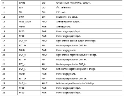 2×14W, 立體聲輸出(4Ω, 12V, THD+N = 1%); 2×10.5W, 立體聲輸出 (6Ω, 12V, THD+N = 1%) |