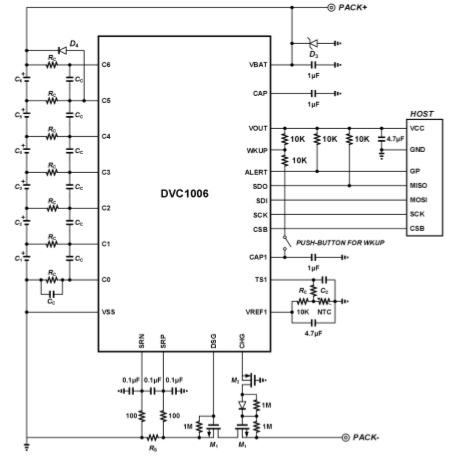 產品功能: DVC1006 是一款采用車規級高壓BCD工藝設計的3-6節鋰電池組監控芯片,通過四線式 SPI 接口與上位機進行通信,形成一套完整的電池組管理系統(BMS)。