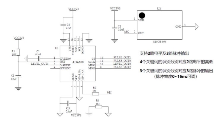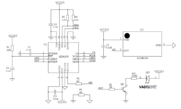 該電路適用于有 I2C 或 SPI 通信的方案,最大支持 30 個關鍵詞的識別,當有語音時,VADINT(PIN3)輸 出高脈沖指示檢測到人聲;當識別到關鍵詞時,KWSINT(PIN4)輸出一個納秒級別的脈沖,提示此時該讀取 ADA100 寄存器,提取識別到的關鍵詞。