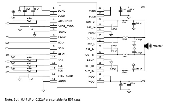 I2S數字輸入33W立體聲D類音頻功放芯片、內置DSP小音量低頻增強等算法 |
