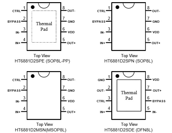 HT6881 1.4W (VDD=3.6V, RL=4Ω, THD+N=10%, Class D) DFN-8L/MSOP-8/ SOP-8/SOP8-PP 2.5V-6.5V 2.65mA低待機(jī)功耗2.8W單聲道D類功放IC TPA2005