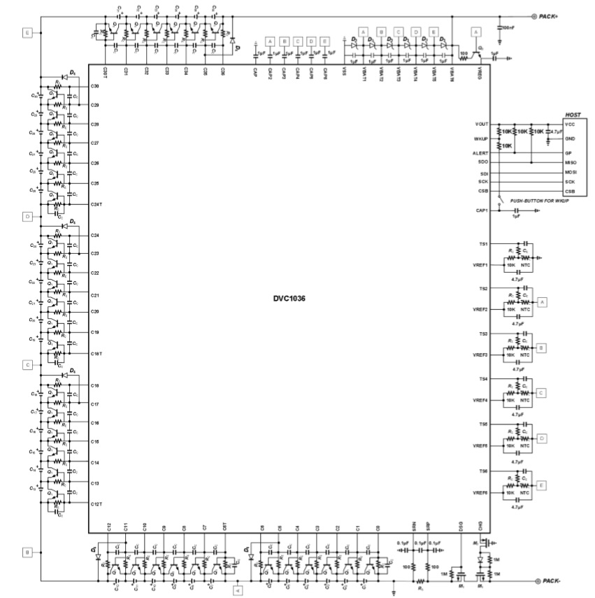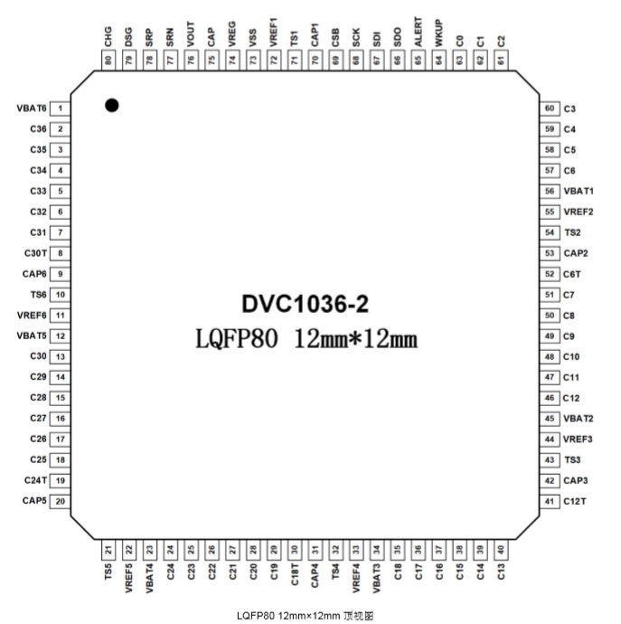 DVC1036是一款采用車規(guī)級高壓 BCD 工藝設(shè)計的多節(jié)鋰電池組監(jiān)控芯片,通過四線式SPI接口與上位機(jī)進(jìn)行通信,形成一套完整的電池組管理系統(tǒng)(BMS)。 DVC1036內(nèi)置6路15位ΣΔADC(VADC)和1 路16 位ΣΔADC(CADC),可以持續(xù)地高精度測量電池組中電池電壓、電池溫度和充/放電 電流等信息,反饋給上位機(jī)完成電池組SOC估算。 DVC1036集成了完整的硬件保護(hù)功能,上位機(jī)可以將電池過壓閾值、電池欠壓閾值、充電過流閾值、放電過流閾值和放電短路閾值配置到芯片寄存器中。芯片就可以在異常發(fā)生時,瞬間完成硬件保護(hù),并立即反饋警報給上位機(jī)。 DVC1036內(nèi)置了36路電池被動均衡驅(qū)動電 路,上位機(jī)可以同時打開所有電池均衡,而不用擔(dān)心影響芯片的硬件保護(hù)功能。 DVC1036還集成低邊充電和放電N型場效應(yīng)管驅(qū)動,上位機(jī)可以通過配置寄存器完成充電或放電管理。同時芯片在異常發(fā)生時,也可以自動關(guān)閉充電或放電場效應(yīng)管,保證電池組安全。