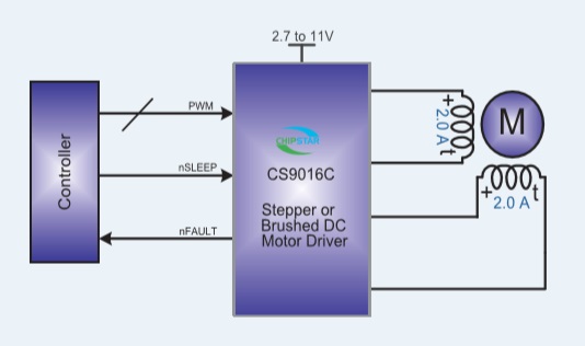 產品功能: CS9016C為玩具、打印機和其它電機一體化應用提供一種雙通道電機驅動方案。