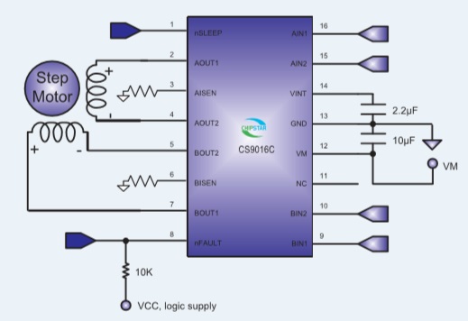 CS9016C為玩具、打印機和其它電機一體化應用提供一種雙通道電機驅動方案。CS9016C有兩路H橋驅動,可以驅動兩路刷式直流電機,一個雙極步進電機,多個螺線管或者其它感性負載。每個H橋的功率輸出模塊由N溝道功率MOSFET組成,用于驅動電機繞組。每個H 橋均具備調節或限制繞組電流的電路。該器件利用故障輸出引腳實現內部關斷功能,提供過流保護、短路保護、欠壓鎖定和過熱保護,并提供了一種低功耗休眠模式。另外提供一個錯 誤輸出管腳nFAULT,當過流過溫保護的時候,nFAULT為低電平.