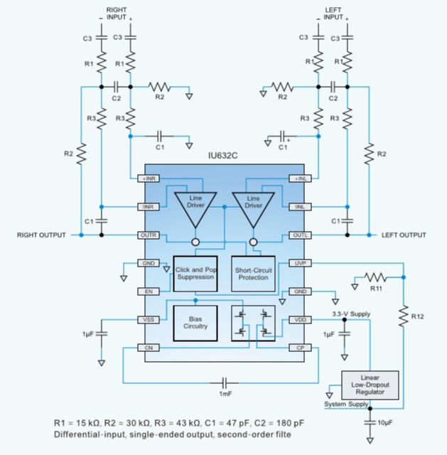 IU632C具有一個外部欠壓檢測器, 該欠壓檢測器在電源被移除時將輸出靜音,從而確保了無雜音的關斷操作。與產生2VRMS/3VRMS輸出的傳統方法相比,在音頻產品中使用IU632C能夠大幅度地減少組件數量.