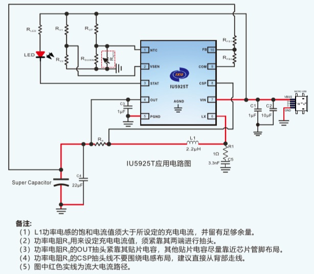 IU5925T通過調節外部反饋電阻的分壓比例,得到不同的恒壓充電電壓值,從而適配不同規格的超級電容。IU5925T具有完善的保護功能,包括輸入欠壓/過壓保護、輸出過壓、電池溫度保護NTC功能、芯片溫度保護。此外芯片通過外接的LED指示燈對充電過程實現全程監控。