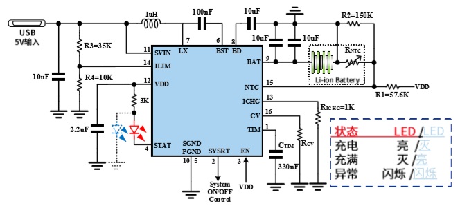 ■ LED指示燈使用時需接限流電阻到VDD,推薦3K。如需使用雙燈方案,必須按照圖中LED燈顏色配置,請購買對應顏色LED燈進行實驗,充 電時紅燈亮,藍燈滅;充滿時藍燈亮,紅燈滅;異常時紅燈藍燈交替閃爍。