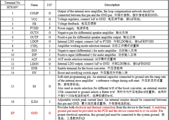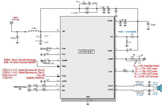 HT81697具有先進的擴頻功能來抑制EMI。如果系統對EMI高度敏感,則可以將升壓關閉,并將功放切換到AB類。 此外,HT81697集成了輸出端過流保護、片內過溫保護、升壓過壓保護等功能。