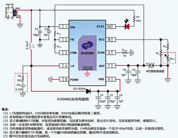 IU5098E是—款5V輸入,最大2A充電電流, 支持2-3節(jié)鋰離子電池/磷酸鐵鋰電池串聯(lián)應(yīng)用的升壓充電管理IC。IU5098E集成功率MOS,采用異步開關(guān)架構(gòu) ,使其在應(yīng)用時(shí)僅需極少的外圍器件,可有效減少整體方案尺寸,降低BOM成本。IU5098E的升壓開關(guān)充電轉(zhuǎn)換器的工作頻率為500KHz,轉(zhuǎn)換效率為90%。