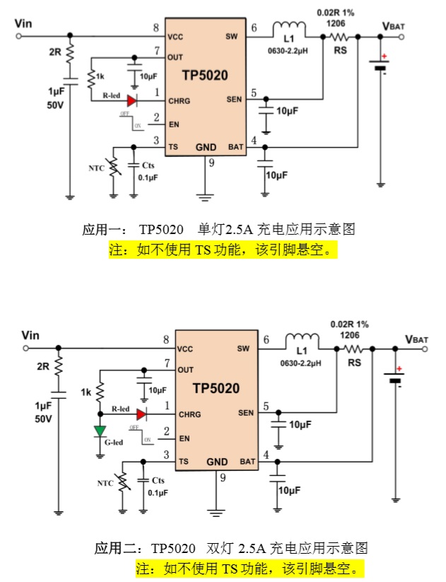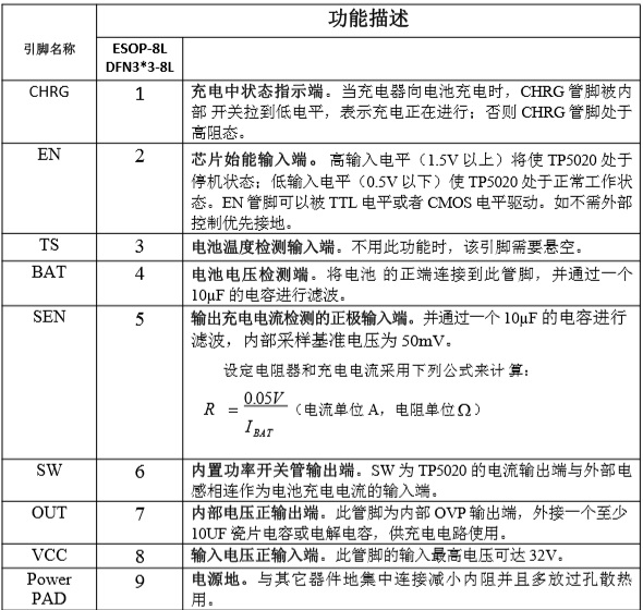 TP5020是一款輸入電源32V高耐壓具備OVP保護功能完整的降壓同步開關型單節鋰電池充電管理芯片。其ESOP-8L/DFN3*3-8L的封裝與簡單的外圍電路,使得TP5020非常適用于便攜式設備的大電流充電管理應用。同時TP5020內置、輸入欠壓保護、輸入過壓保護、芯片過溫保護、充電電池溫度檢測、BAT端短路保護、充電安全定時時間、EN 使能端等功能。 TP5020具有寬輸入電壓,對電池充電分為0V充電電流、涓流預充、恒流、恒壓階段, 恒流充電電流都通過外部電阻調整,最大充電電流達2.5A。TP5020采用頻率1.5MHz的開關工作模式使它可以使用較小的外圍器件,并在大電流充電中仍保持較小的發熱量。TP5020內置降壓功率MOSFET、防倒灌電路,所以無需防倒灌肖特基二極管等外圍保護。