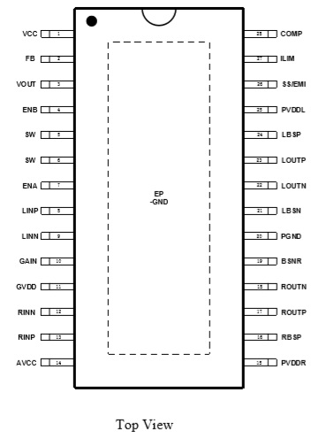 產(chǎn)品功能: VBAT = 3.7V, 2×10W (VOUT=9.5V, THD+N = 10%) ; VBAT = 7.2V, 2×16W (VOUT=12V, THD+N= 10%)