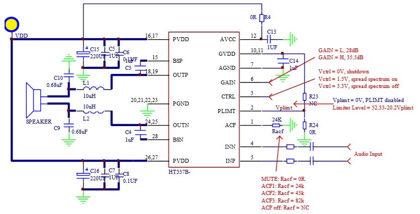 HT337B具有防削頂失真(ACF)輸出控制 功能,可檢測并抑制由于輸入音樂、語音信號幅度過大所引起的輸出信號削頂失真(破音),也能自適應地防止在電源電壓下降所造成的輸出削頂,顯著提高音質,創造非常舒適的聽音享受,并保護揚聲器免受過載損壞。