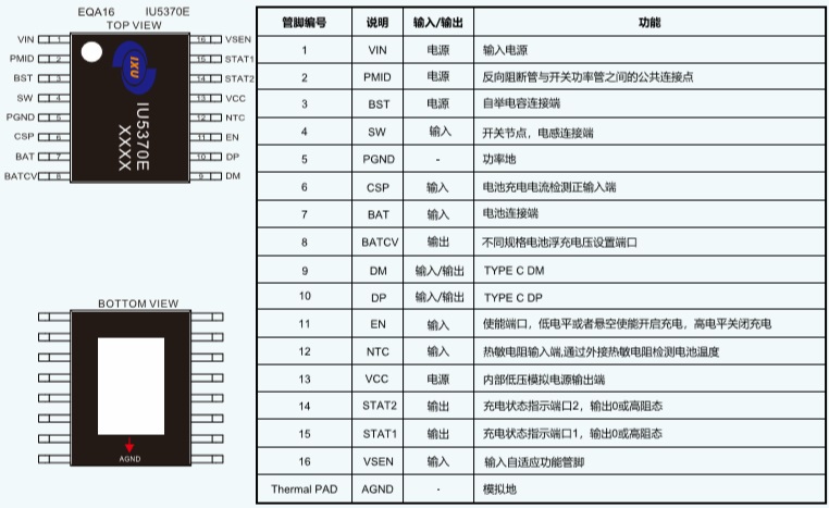 IU5370 IU5370E是一款適用于Type-c接口輸入,自動申請快充輸入,36V高耐壓、3.6V-20V寬輸入范圍,支持多種電池規(guī)格的單節(jié)鋰電池/鋰離子聚合物電池以及磷酸鐵鋰電池的同步降壓充電管理IC。 EQA-16 適用于Type C、輸入集成36V OVP、內(nèi)置快充申請功能及優(yōu)化EMI特性的頻率抖動功能,3.6~20V寬輸入范圍,最大3.5A同步降壓型單節(jié)多類型鋰電池充電管理IC