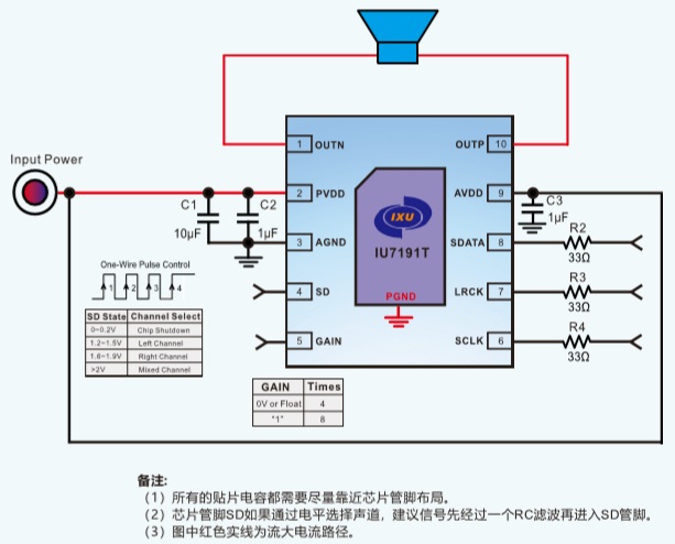 IU7191T為單聲道音頻功放。但通過SD管腳設(shè)置不同的電平或者一線脈沖輸入,這兩種方式可以進(jìn)行左/右/混合三種聲道的選擇。因此可同時(shí)選用兩顆芯片,靈活地組成立體聲產(chǎn)品。