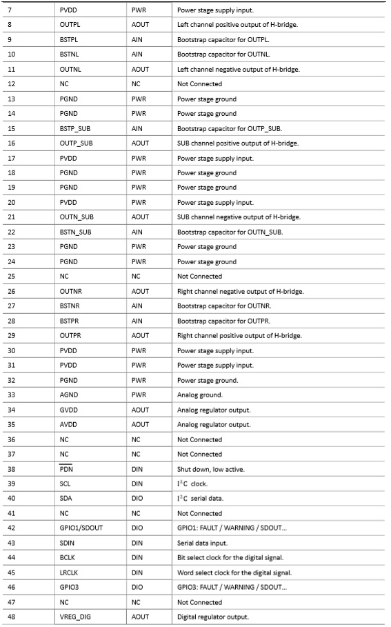 ACM8636一款2.1通道數字輸入音頻功率放大器。供電電壓范圍在 4.5V-26.4V。在2.1通道工作模式, 2 x 8 歐+4 歐負載下,輸出功率可以達到2×30W+60W ; THD+N不超過1%。