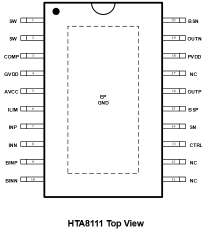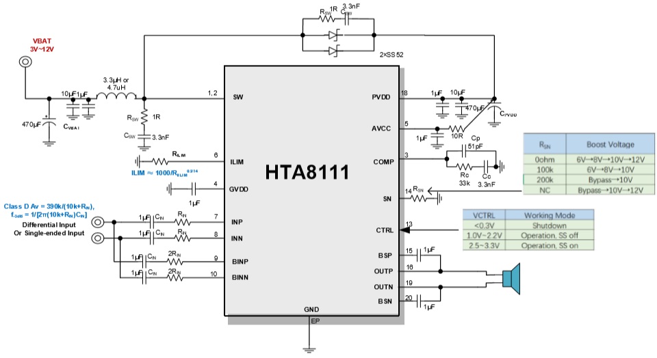 HTA8111的增益為32dB。 此外,HTA8111集成了輸出端過流保護、片內過溫保護、升壓過壓保護等功能。