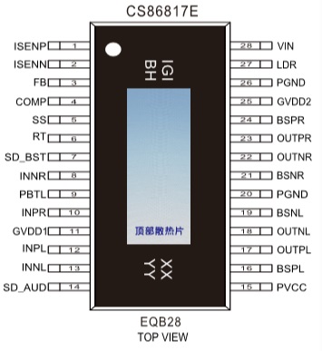 CS86817E提供了獨特的頂部散熱片的EQB28封裝形式供客戶選擇,其額定的工作溫度范圍為-40℃至85℃。