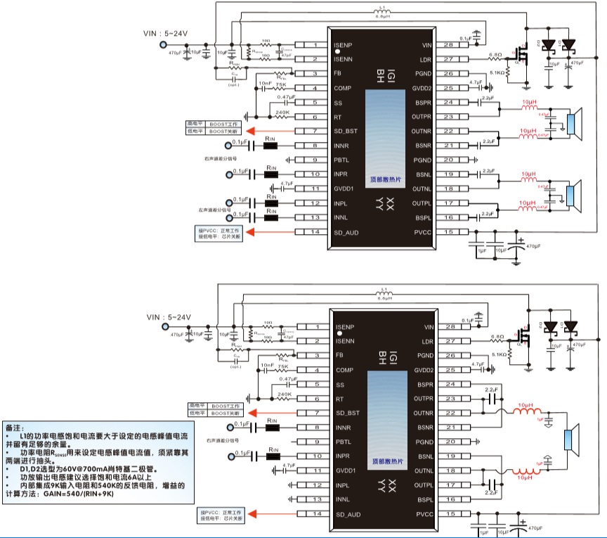 VIN=6.5-24V  PVcc=24V  P0=2×60W@THD+N=1%