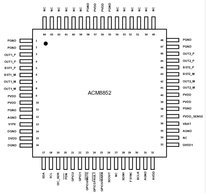 ACM8852 一款高度集成、高效率、低EMI的雙通道數字輸入D類音頻功放。