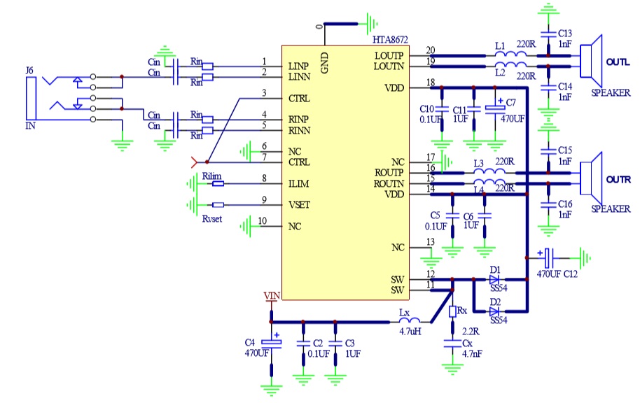 HTA8672具有AB類和D類的自由切換功能,在受到D類功放EMI干擾困擾時,可隨時切換至AB類音頻功放模式。